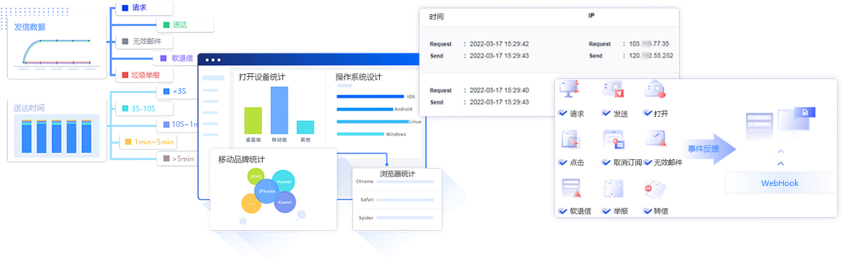 为客户的邮件发送提供三种接口接入方式,分别为SMTP、API、SDK。适配开发者多样化的代码习惯。